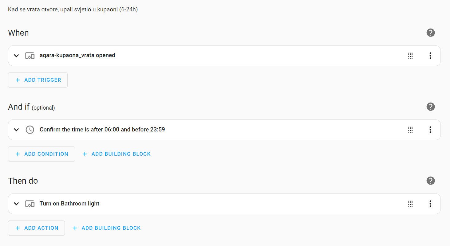 Na gornjoj slici vidljivo je ograničenje (And if) koje navedeni automatizam uključuje samo u vremenu između 6:00 i 24:00. Za onoga tko se nađe u kupaonici u nekoj noćnoj šetnji, ne želimo da ga se totalno razbudi pa svjetlo iz tog razloga ostaje ugašeno 🤭. Naravno, uvijek postoji opcija da ga se ručno na standardni prekidač upali.