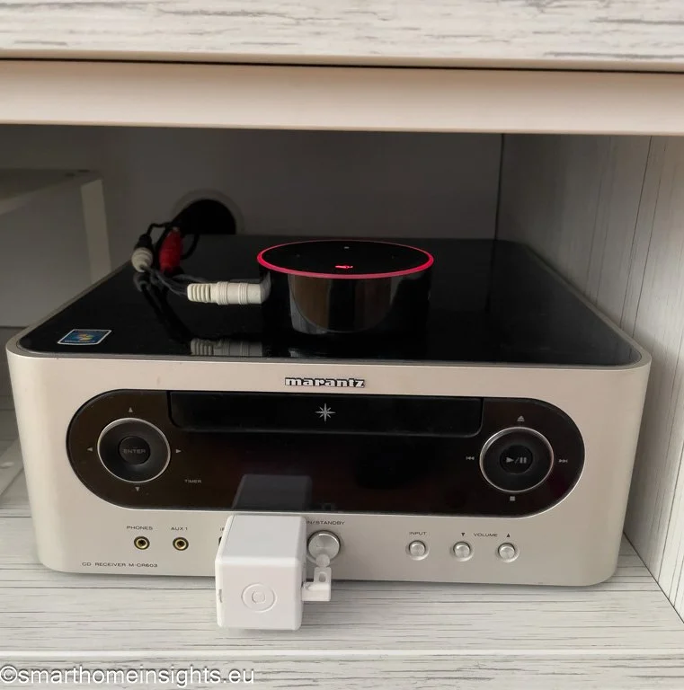 Na gornjoj slici je vidljiv Alexa Echo Dot 2. generacije - ovaj mali crni “pak” što svijetli crveno na liniji. On je uz pomoću audio kabela spojen na standardni AUX ulaz Maranz linije. Crveni krug što na njemu svijetli označava da je isključen mikrofon, a što je napravljeno kako Alexa na tom uređaju ne bi reagirala na glasovne naredbe. Inače, sam “pak” je skriven iza linije, a ovdje je izvučen samo za potrebe ovog slikanja 😁.