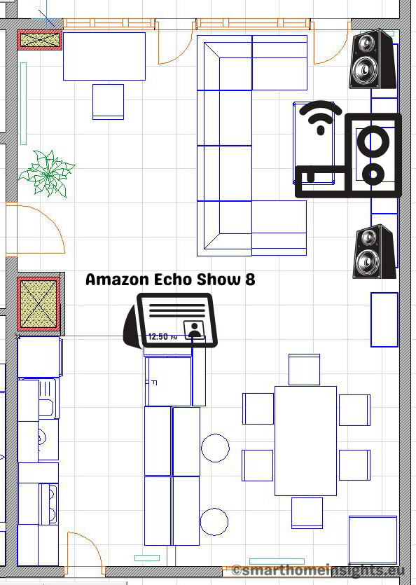 U našem domu dnevni boravak, kuhinja i blagovaona čine jedan (open-space) prostor. Kao primarni i jedini glasovni pomoćnik u tom prostoru koristimo Amazon Echo Show 8, a koji se fizički nalazi otprilike na sredini prostora: