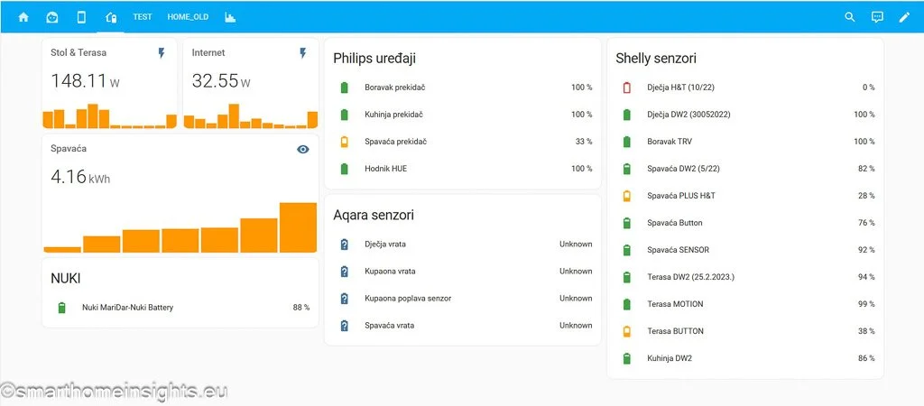 Nadzor nad statusom baterija u pametnim uređajima imamo u Home Assistant platformi, gdje postoje kartice iz kojih je vidljiv status svih baterijski pogonjenih uređaja. Dodatno, konfigurirao sam i notifikacije koje mi dolaze na mobitel ako je neka od baterija ispod praga od 20% svog kapaciteta. Na ta dva načina unaprijed sam informiran da se vrijeme za zamjenu baterija bliži.