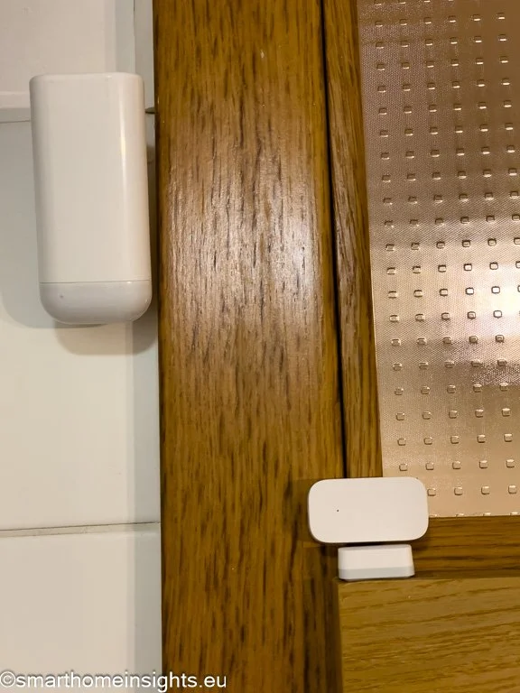 Slijedi puno jednostavniji dio - Aqara senzora za vrata i prozore i Shelly Motion 2 Sensor koje jednostavno zalijepite - senzor za vrata se sastoji od 2 dijela od kojih jedan ide na sama vrata, dok se drugi lijepi na okvir. Senzor pokreta potrebno je smjestiti tamo gdje će imati najbolji pogled na prostoriju: